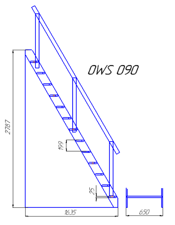 Сходи «гусячим кроком» , OWS-090 , конструктор (без фарбування) - висота між поверхами - 2787 мм, ширина маршу 675 мм., довжина по підлозі -1635 мм.